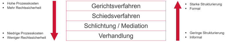 Je nach Konstellation und Bedürfnis bieten sich unterschiedliche Instrumente der Konfliktlösung an. Angefangen bei reinen Verhandlungen als kostengünstigste Variante bis zum Gerichtsverfahren, welches eine klare Struktur und eine hohe Rechtsicherheit bietet.