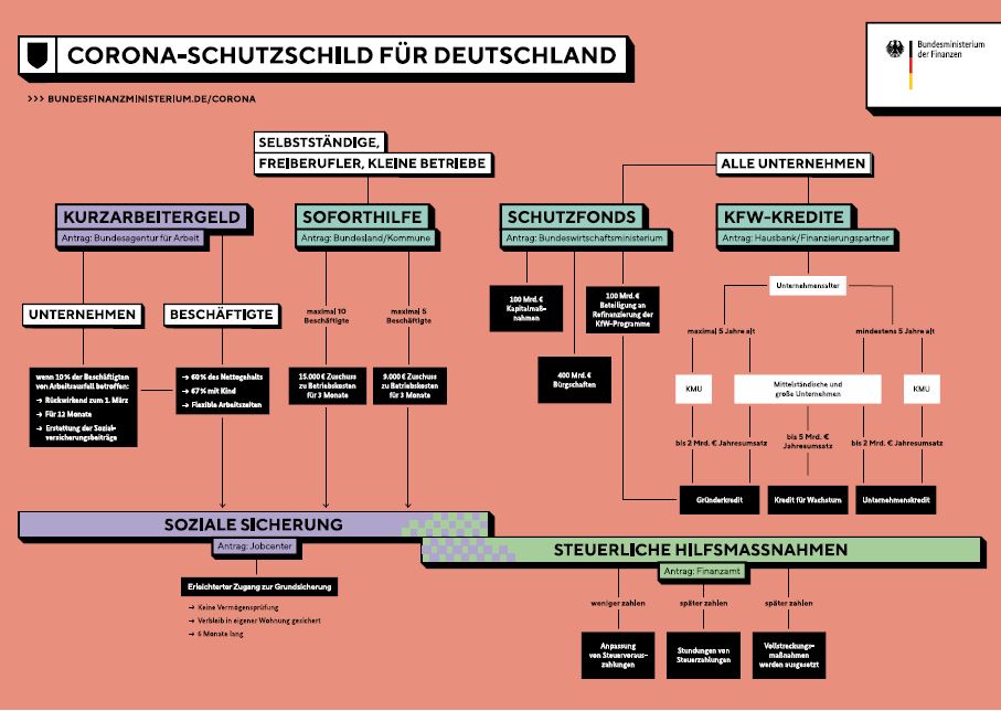 Eine vollständige Erklärung zu den Hilfsmaßnahmen liefert das Finanzministerium gleich mit und ist zu finden unter: Corona-Schutzschild – Übersicht der Hilfsmaßnahmen